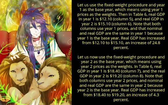 So far, we have looked at GDP measured in current dollars, or the current prices we pay for things. When a variable is measured in current dollars, it is described in nominal terms. Nominal GDP is GDP measured in current dollars---all components of GDP valued at their current prices. In many applications of macroeconomics, nominal GDP is not a very desirable measure of production. Why? Assume there is only one good---say, pizza. In each year 1 and 2, 100 units (slices) of pizza were produced. Production thus remained the same for year 1 and year 2. Suppose the price of pizza increased from $1 per slice in year 1 to $1.10 per slice in year 2. Nominal GDP in year 1 is $100 (100 units * $1 per unit), and nominal GDP in year 2 is $1.10 (100 units * $1.10 per unit). Nominal GDP has increased by $10, even though no more slices of pizza were produced. If we use nominal GDP to measure growth, we can be misled into thinking production has grown when all that has really happened is a rise in the price level (inflation). If there were only one good in the economy---like pizza---it would be easy to measure production and compare one year's value to another's. We would add up all the pizza slices produced each year. In the example, production is 100 in both years. If the number of slices had increased to 105 in year two, we would say production increased by 5 slices between year one and year two, which is a 5 percent increase. Alas, however, there is more than one good in the economy. The following is a discussion of how the Bureau of Economic Analysis (BEA) adjusts nominal GDP for price changes. As you read the discussion, keep in mind that this adjustment is not easy. Even in an economy of just apples and oranges, it would not be obvious how to add up apples and oranges to get an overall measure of output. The BEA's task is to add up thousands of goods, each of whose price is changing over time. In the following we will use the concept of a weight, either price weights or quantity weights. What is a weight? It is easiest to define the term by an example. Suppose in an economics course there is a final exam and two other tests. If the final exam counts for one-half of the grade and the other two tests for one-fourth each, the "weights" are one-half, one-fourth, and one-fourth. If instead the final exam counts for 80 percent of the grade and the other two tests for 10 percent each, the weights are .8, .1, and .1. The more important an item is in a group, the larger its weight. Calculating Real GDP Nominal GDP adjusted for price changes is called real GDP. All the main issues involved in computing real GDP can be discussed using a simple three-good economy and 2 years. Table 6 presents all the data that we will need. The table presents price and quantity data for two years and three goods. The goods are labeled A, B, and C, and the years are labeled 1 and 2. P denotes price, and Q denotes quantity. TABLE 6 The first thing to note from Table 6 is that nominal output in current dollars in year one for good A is the price of good A in year 1 ($0.50) times the number of units of good A produced in year 1 (6), which is $3.00. Similarly, nominal output in year 1 is 7 * $0.30 = $2.10 for good B and 10 * $0.70 = $7 for good C. The sum of these three amounts, $12.10 in column 5, is nominal GDP in year 1 in this simple economy. Nominal GDP in year 2---calculated by using the year 2 quantities and the year 2 prices---is $19.20 (column 8). Nominal GDP has risen from $12.10 in year 1 to $19.20 in year 2, an increase of 58.7 percent. You can see that the price of each good changed between year 1 and year 2---the price of good A fell ($0.50 cents to $0.40) and the price of goods B and C rose (B from $0.30 to $1.00; C from $0.70 to $0.90). Some of the change in nominal GDP between years 1 and 2 is due to price changes and not production changes. How much can we attribute to price changes and how much to production changes? Here, things get tricky. The procedure that the BEA used prior to 1996 was to pick a base year and use the prices in that base year as weights to calculate real GDP. This is a fixed-weight procedure because the weights used, which are the prices, are the same for all years---namely, the prices that prevailed in the base year. This example shows that growth rates can be sensitive to the choice of the base year---24.8 percent using year 1 prices as weights and 4.3 percent using year 2 prices as weights. The old BEA procedure simply picked one year as the base year and did all the calculations using the prices in that year as weights. The new procedure makes two important changes. The first (using the current example) is to "split the difference" between 24.8 percent and 4.3 percent. What does "splitting the difference" mean? One way would be to take the average of the two numbers, which is 14.55 percent. What the BEA does is to take the geometric average (The geometric mean is most appropriate for series that exhibit serial correlation. This is especially true for investment portfolios (investopedia.com)], which for the current example is 14.09 percent. These two averages (14.55 percent and 14.09 percent) are quite close, and the use of either would give similar results. The point here is not that the geometric average is used, but that the first change is to split the difference using some average. Note that this new procedure requires two "base" years, because 24.8 percent was computed using year 1 prices as weights and 4.3 percent was computed using year 2 prices as weights. The second BEA change is to use years 1 and 2 as the base years when computing the percentage change between years 1 and 2, then use years 2 and 3 as the base years when computing the percentage change between years 2 and 3, and so on. The two base years change as the calculations move through time. The series of percentage changes computed in this way is taken to be the series of growth rates of real GDP, and so in this way n
