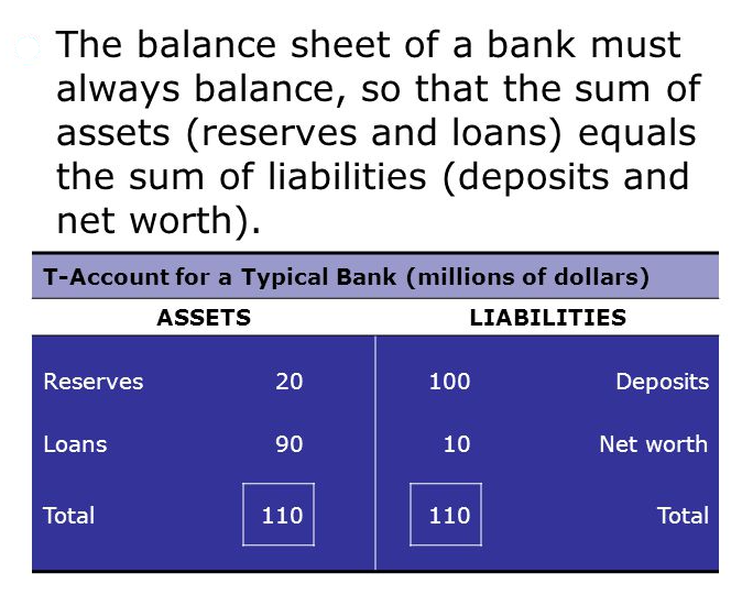 To understand how the modern banking system works, you need to be familiar with some basic principles of accounting. Once you are comfortable with the way banks keeps their books, the whole process of money creation will seem logical. A brief review of accounting Central to accounting practices is the statement that "the books always balance." In practice, this means that if we take a snapshot of a firm---any firm, including a bank---at a particular moment In time, then by definition: Assets - Liabilities ≡ Net Worth, or Assets ≡ Liabilities + Net Worth Assets are things a firm owns that are worth something. For a bank, these assets include the bank building, its furniture, its holdings of government securities, cash in its vault, bonds, stocks, and so forth. Most important among the bank's assets, for our purposes at least, are its loans. A barrower gives the bank an IOU, a promise to repay a certain sum of money on or by a certain date This promise is an asset to the bank because it is worth something. The bank could (and sometimes does) sell the IOU to another bank for cash. Other bank assets include cash on hand (sometimes called vault cash) and deposits with the United States' central bank the Federal Reserve Bank (the Fed). Federal banking regulations require that banks keep a certain portion of their deposits on hand as vault cash or on deposit with the Fed. A firm's liabilities are its debts---what it owes. A bank's liabilities are the promises to pay, or IOUs, that it has issued. A bank's most important liabilities are its deposits. Deposits are debts owed to the depositors, because when you deposit money in your account, you are in essence making a loan to the bank. The basic rule of accounting says that if we add up a firm's assets and then subtract the total amount it owes to all those who have lent it funds, the difference is the firm's net worth. Net worth represents the value of the firm to its stockholders or owners. How much would you pay for a firm that owns $200,000 of diamonds and had borrowed $150,000 from a bank to pay for them? The firm is worth $50,000---the difference between what it owns and what it owes. If the price of diamonds were to fall, bringing their value down to only $150,000, the firm would be worth nothing. We can keep track of a bank's financial position using a simplified balance sheet called a T-account. By convention, the bank's assets are listed on the left side of the T-account and its liabilities and net worth, on the right side. By definition, the balance sheet always balances, so that the sum of the items on the left side of the T-account is exactly equal to the sum of the items on the right side. The T-account in Figure 1 shows a bank having $110 million in assets, of which $20 million dollars are reserves, the deposits that the bank has made at the Fed and its cash on hand (coins and currency). Reserves are an asset to the bank because it can go to the Fed and get cash for them, just the way you can go to the bank and get cash for the amount in your savings account. Our bank's other asset is its loans, worth $90 million. FIGURE 1 Why do banks hold reserves/deposits at the Fed? There are many reasons, but perhaps the most important is the legal requirement that they hold a certain percentage of their deposit liabilities as reserves. The percentage of its deposits that a bank must keep as reserves is known as the required reserve ratio. If the reserve ratio is 20 percent, Then a bank with deposits of $100 million must hold $20 million as reserves, either as cash or as deposits at the Fed. To simplify, we will assume that banks hold all of their reserves in the form of deposits at the Fed. On the liability side of the T-account, the bank has taken deposits of $100 million, so it owes this amount to its depositors. This means that the bank has a net worth of $10 million to its owners ($110 million in assets - $100 million in liabilities = 10 million dollars net worth). The net worth of the bank is what "balances" the balance sheet. Remember: If a bank's reserves increase by $1 then one of the following must also be true: (1) its other assets (e.g., loans) decrease by $1; (2) its liabilities (deposits) increase by $1; or (3) its net worth increases by $1. Various fractional combinations of these are also possible. *CASE & FAIR, 2004, PRINCIPLES OF ECONOMICS, 7TH ED., PP. 481-482* end |