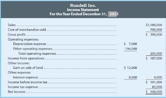 The income statement for Rundell Inc. in Exhibit 7, from part 99 and reintroduced below, reports a gain of $12,000 on the sale of land. As we discussed previously, the gain is included in the proceeds from the sale of land which is reported as part of the cash flows from investing activities.