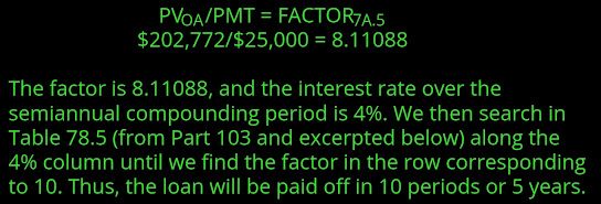 Solving for the Number of Compounding Periods. Problems may also require solving for the number of compounding periods. Again, we can use the present value of an ordinary annuity factors in Table 7A.5 to solve by using Equation 7.17 (from Part 107 and reintroduced below) to determine the factor and then finding the corresponding number of periods in the factor table.